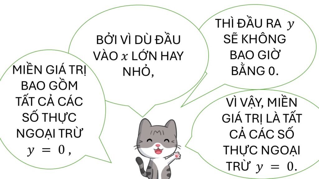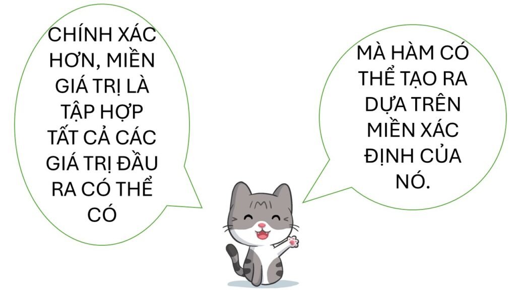 - Miền giá trị là tập hợp tất cả các giá trị y = f(x) mà hàm số có thể nhận khi x chạy trong miền xác định.