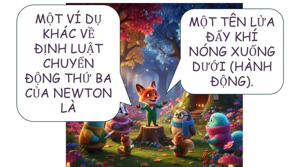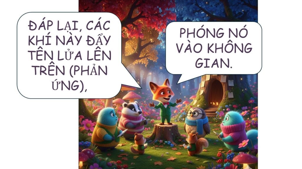 - Tên lửa bay lên: Tên lửa đẩy khí ra phía sau với một lực rất lớn (lực tác động). Đáp lại, khối khí đó đẩy tên lửa bay về phía trước (phản lực).