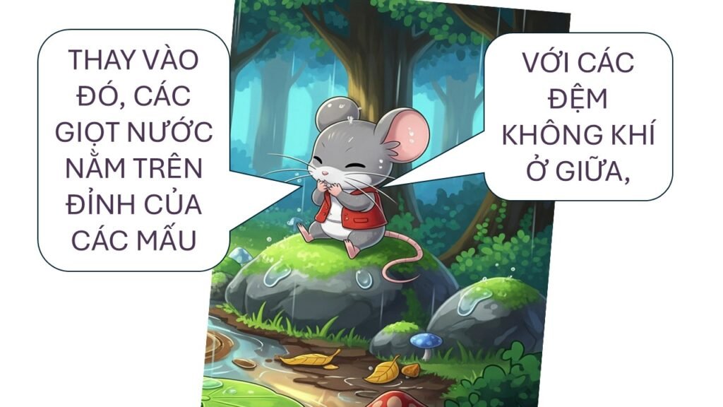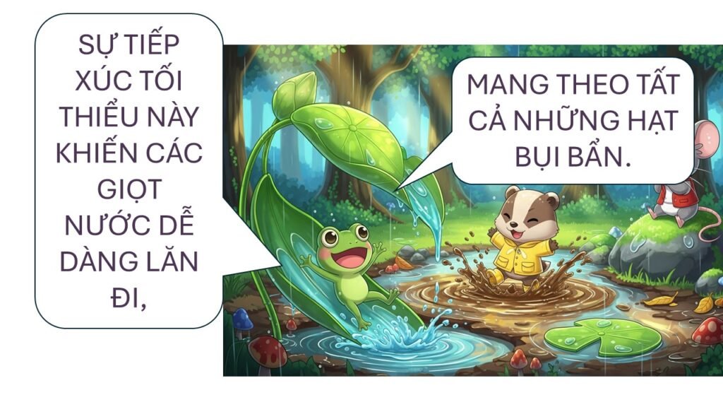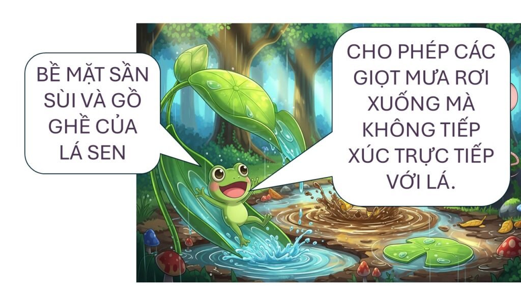 Sự kết hợp của hai lớp cấu trúc này tạo ra một bề mặt cực kỳ gồ ghề. Khi giọt nước tiếp xúc với lá, nó không thực sự chạm vào toàn bộ bề mặt. Thay vào đó, nó nằm trên một “tấm đệm không khí” được giữ lại giữa các nốt nhú. Việc giọt nước chỉ tiếp xúc với các đỉnh nhú và lớp không khí bên dưới làm giảm đáng kể lực bám dính.