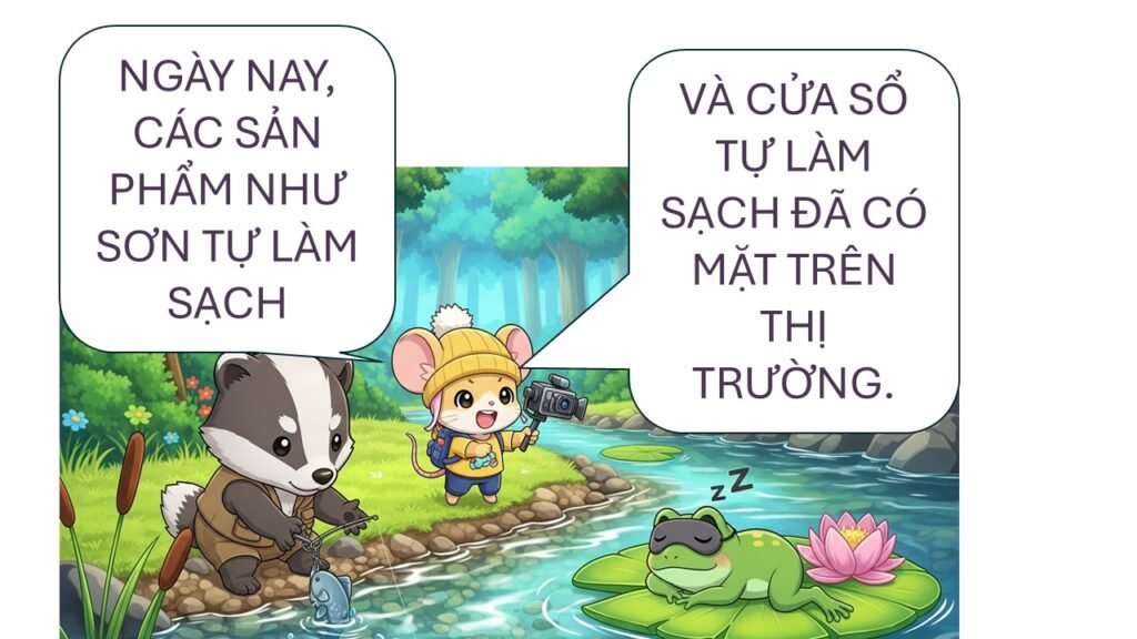 - Kính tự làm sạch: Cửa sổ, tấm pin năng lượng mặt trời có lớp phủ đặc biệt, giúp mưa rửa sạch bụi bẩn, tăng hiệu quả hoạt động.