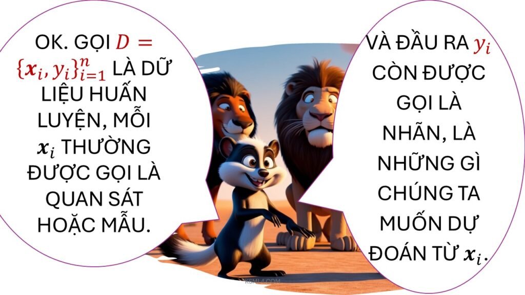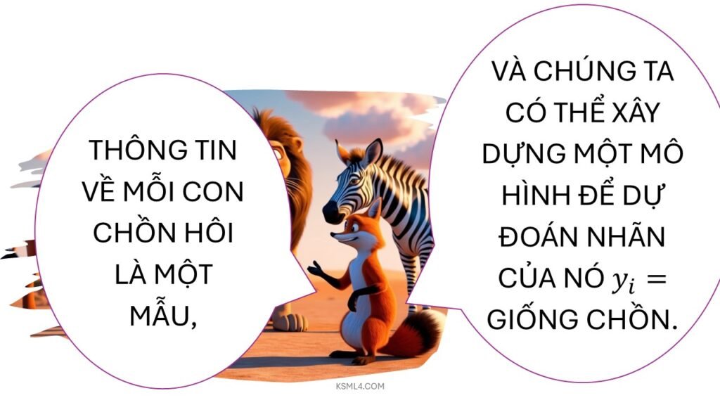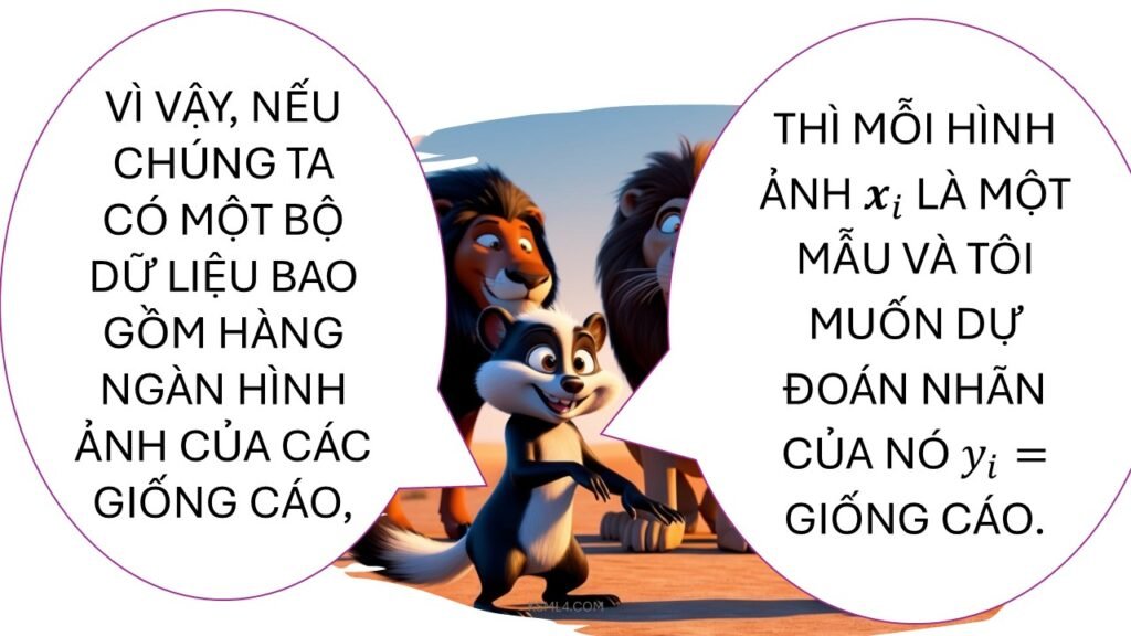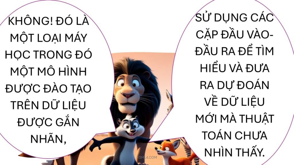 Hãy tưởng tượng bạn dạy một chú cún robot nhận diện mèo và chó. Bạn đưa cho nó 1000 bức ảnh: 500 ảnh mèo, 500 ảnh chó, mỗi ảnh đều ghi rõ “mèo” hay “chó”. Chú robot sẽ phân tích đặc điểm (tai nhọn, đuôi dài, mắt tròn, v.v.) để học cách phân biệt. Sau đó, bạn đưa ảnh mới không nhãn, nó sẽ tự đoán: “Hừm, tai nhọn, chắc là mèo!”