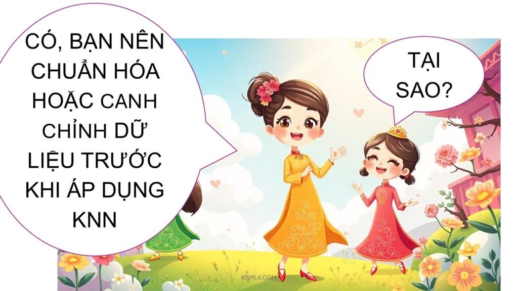 Đây là một bước tiền xử lý thiết yếu cho KNN vì thuật toán này dựa hoàn toàn vào việc tính toán khoảng cách giữa các điểm dữ liệu. Nếu các đặc trưng trong tập dữ liệu có thang đo (scale) khác nhau đáng kể (ví dụ: một đặc trưng “tuổi” có giá trị từ 0-100, trong khi một đặc trưng “thu nhập” có giá trị từ 0-1.000.000), đặc trưng có thang đo lớn hơn sẽ chi phối việc tính toán khoảng cách một cách không cân xứng. Điều này làm giảm đáng kể ảnh hưởng của các đặc trưng có thang đo nhỏ hơn, dẫn đến các phân loại hoặc dự đoán không chính xác.