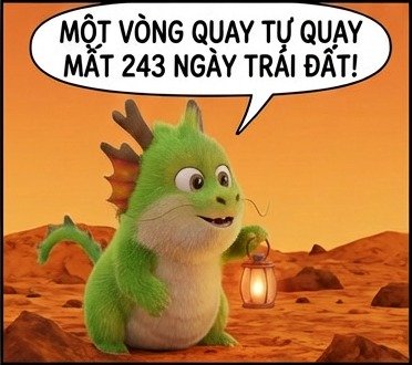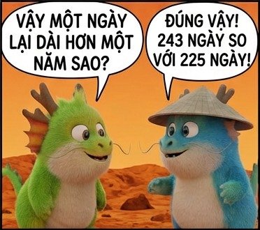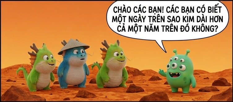 sao kim kỳ lạ: ngày dài hơn nămbởi Kurious Fox CÁC BẠN CÓ BIẾT MỘT NGÀY TRÊN SAO KIM DÀI HƠN CẢ MỘT NĂM TRÊN ĐÓ KHÔNG? Venus: a quirky planet Chia sẻ: Share on Facebook (Mở trong cửa sổ mới) Facebook Share on X (Mở trong cửa sổ mới) X Share on LinkedIn (Mở trong cửa sổ mới) LinkedIn Share on Reddit (Mở trong cửa sổ mới) Reddit Share on WhatsApp (Mở trong cửa sổ mới) WhatsApp Share on Pinterest (Mở trong cửa sổ mới) Pinterest Share on Threads (Mở trong cửa sổ mới) Threads Email a link to a friend (Mở trong cửa sổ mới) Email Related Gửi phản hồiHủy