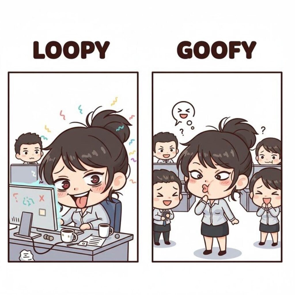 - Liên tưởng âm thanh: Loopy và goofy đều là từ không trang trọng, mô tả hành vi ngớ ngẩn, kỳ quặc
