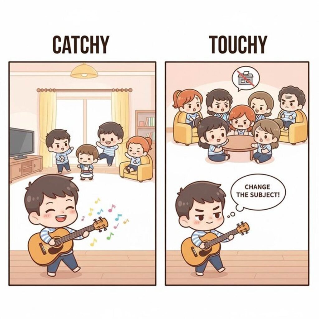 → Nhạc sĩ chơi một giai điệu bắt tai để đổi chủ đề, vì anh biết chính trị là chủ đề nhạy cảm với gia đình. - IELTS/TOEFL: Dùng để mô tả chủ đề nhạy cảm (e.g., That is a touchy subject.) hoặc người dễ bị tổn thương (e.g., He is very touchy about his work.)