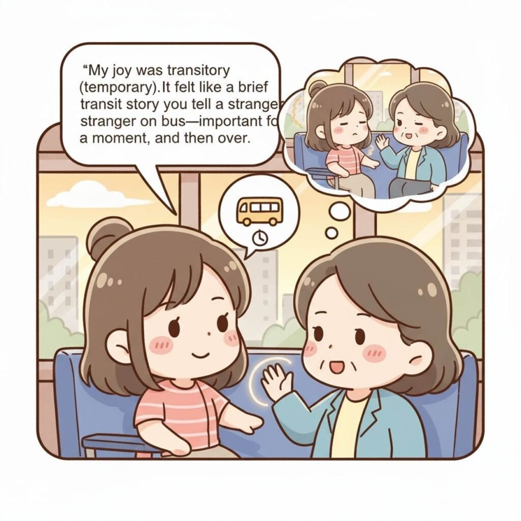 → Niềm vui của tôi chỉ là tạm thời. Nó giống như một câu chuyện ngắn kể cho người lạ trên xe buýt – quan trọng trong khoảnh khắc, rồi kết thúc.