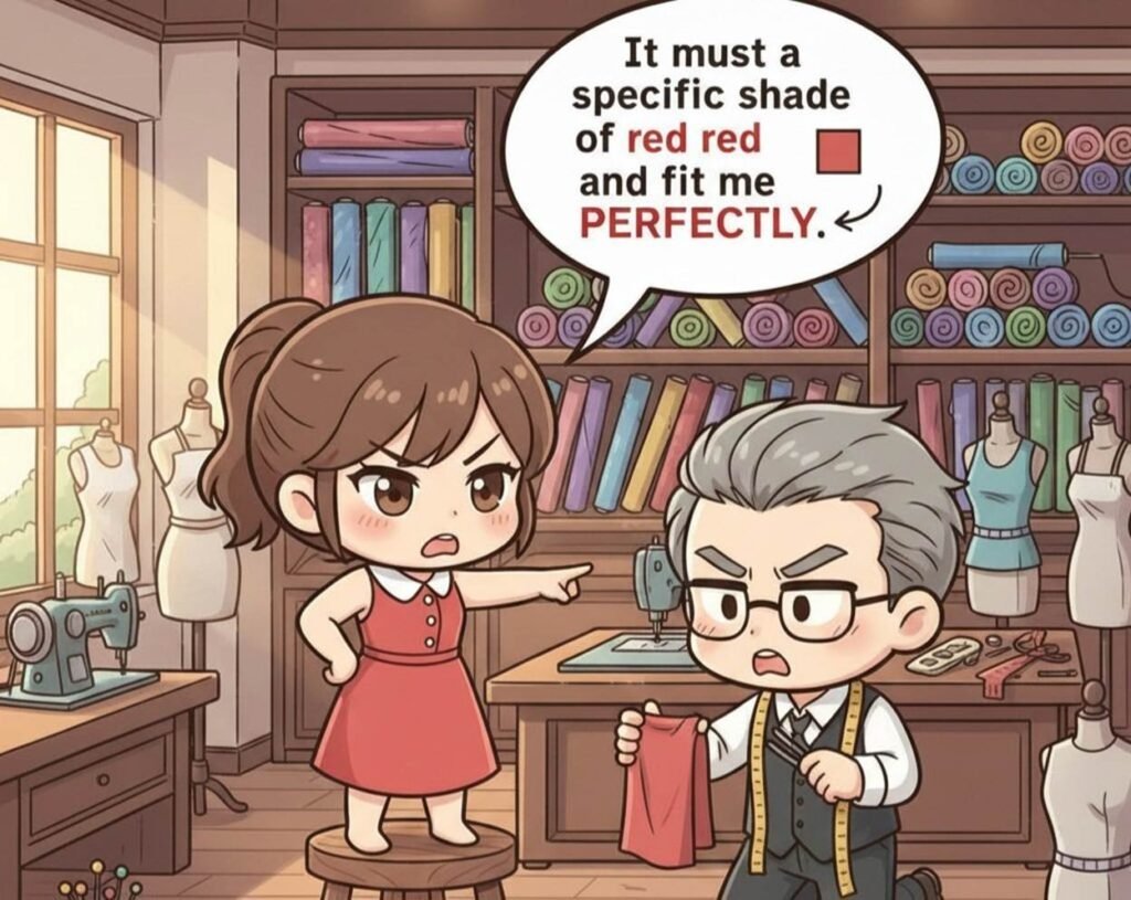 → Tôi cần một bộ đồ được may riêng cho buổi ra mắt phim. Tôi nói với thợ may: “Nó phải là màu đỏ cụ thể và vừa vặn hoàn hảo với tôi.”
