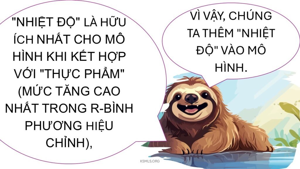 “Nhiệt độ” thêm giá trị nhiều nhất vào mô hình của chúng ta khi kết hợp với “Thức ăn” (tăng R bình phương hiệu chỉnh cao nhất), vì vậy chúng ta thêm “Nhiệt độ” vào mô hình.